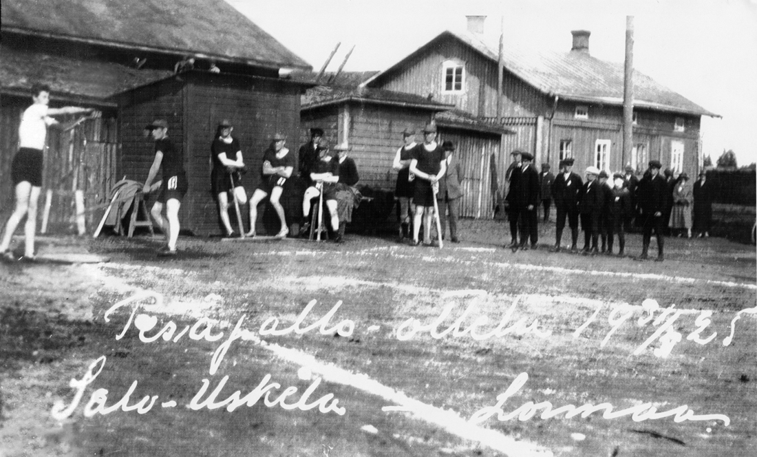 | Loimaan ja Salo-Uskelan suojeluskuntajoukkueet vastakkain vanhalla torilla v.1925 Lyömässä Eino Raunio, Yrjö Tanhuanpää nojailee mailaansa kopin seinustalla. |