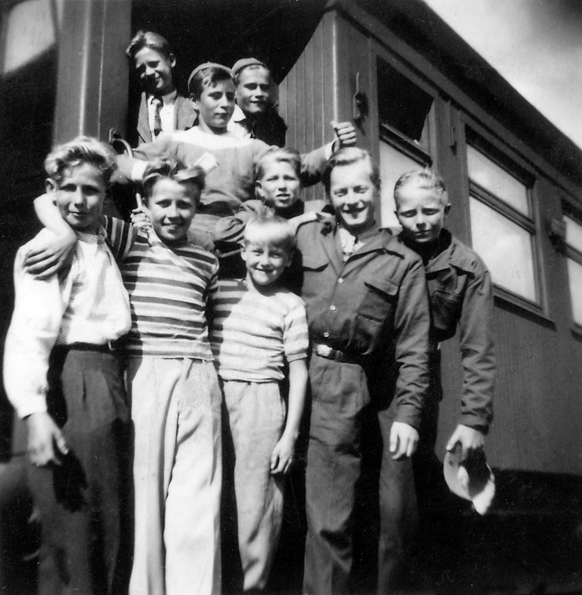 | Pojat Loimaan rautatieasemalla ennen junan lähtöä. Edessä on matka Partaharjulle, jossa järjestettiin pesäpalloliiton alle 16-vuotiaiden poikien valtakunnallinen leiri. Tästä joukosta löytyy useita tulevan LP:n vuoden 1955 nuorten hopeajoukkueen jäseniä. Mm. Simo Koivula, Veijo Salonen, Matti Korpela ja Matti Leimu. Kuva on Simo Koivulan kansiosta. Tiedot korjattu ja täydennetty 12.12.2009 Seppo Laineen lähettämän viestin mukaisiksi. |