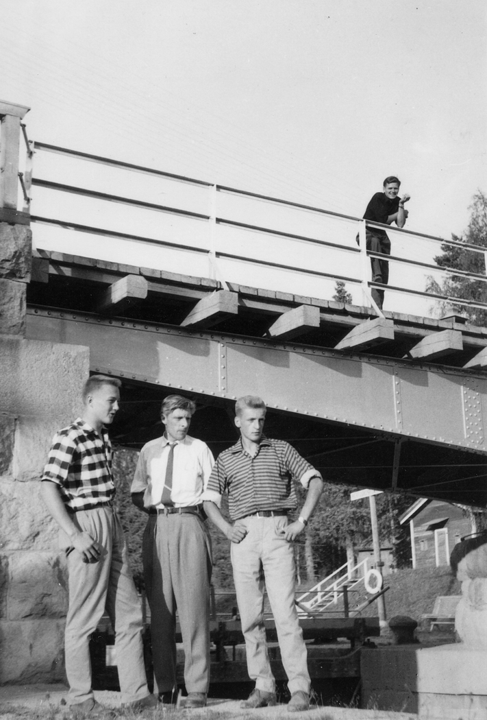 Pelimatkalla Ylihärmään la 15.8.1959. Alhaalla vasemmalta: Seppo Laine Arto Ojala Pekka Kytö Ylhäällä sillalla: Aksu Jokinen |