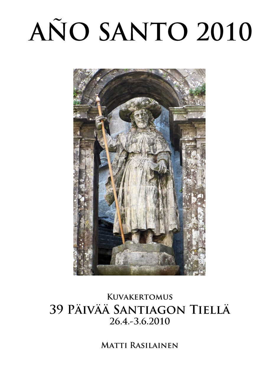 Tästä otoksesta on poimittu kertomuksen kuvitus. 0. Matkan alku [17/7 10], 1. Roncesvalles-Zubiri [17/7 10], 2. Zubiri-Pamplona [20/7 10], 3. Pamplona-Cizur Menor [24/7 10], 4. Cizur Menor-Puente la Reina [25/7 10], 5. Puente la Reina-Estella [12/8 10], 6. Estella-Los Arcos [17/8 10], 7. Los Arcos-Logroño [23/8 10], 8. Logroño-Navarrete [29/8 10], 9. Navarrete-Nájera [1/9 10], 10. Nájera-Santo Domingo [11/9 10], 11. Santo Domingo-Belorado [20/9 10], 12. Belorado-Agés [29/9 10], 13. Agés-Burgos [16/11 10], 14. Burgos-Hornillos del Camino [12/1 11] 15. Hornillos del Camino-Castrojeriz [25/6 11] Kuvakertomus muodostuu pdf-dokumenteistä, joita on tarkoitus katsella aukeama kerrallaan. Kuitenkin niin, että ensimmäinen sivu on yksinäinen kansilehti. Tämän mukaiset asetukset pitäisi laittaa päälle Acrobat Readerissä, jos haluaa katsoa esitystä alkuperäisessä muodossa. Palautetta voi lähettää osoitteeseen matti.rasilainen@welho.com . Hyvää lukemista (suomalaisia kertomuksia caminosta): -Susanna Linna: "Simpukankuorelta kotiin", 2004 Kustannus Oy Arkki [camino: 4.6.-4.7.2003] -Tuija Lehtonen: "Kävellen Santiago de Compostelaan", 2005 [camino: 29.5.-28.6.2003] -Tapani Tukiainen: "Kivipallo, matkalla pyhiin", 2006 Porvoon Julmapaino [camino:26.4.-1.6.2003] -Kari Selen: "Simpukan tähden", 2006 Edita [camino: 26.4.-13.5.2002 ja 26.4.-17.5.2003] -Pedro Hovikoski: "Euroopan halki pyhiinvaeltajien jalanjäljissä" 2008 omakustanne [camino: Hattula 26.5.-11.12.2003 Santiago de Compostela] -Martti Issakainen: "Jaakon tiellä", 2008 Suomen Lähetysseura -Anneli Mylläri: "33 päivää Santiago de Compostelaan", 2009 Mediapinta [camino: 30.3.-2.5.2006] -Johannes Marjakangas: "Elämäni vaellus - Lähdin ja sain paljon", 2009 omakustanne [camino: 15.9.-15.10.2007] -Heli von Bruun, Mikko von Bruun: "Linnunradan tiellä" 2009 Salut Oy (mietelmiä) -Pirkko Vekkeli, Liisa Jäppinen: "Tätinä taipaleella" 2012 Helsinki-Kirjat [camino: 31.3.-14.4.2007, 5.5.-22.5.2009, 4.5.-20.5.2010, 3.5.-19.5.2011] |