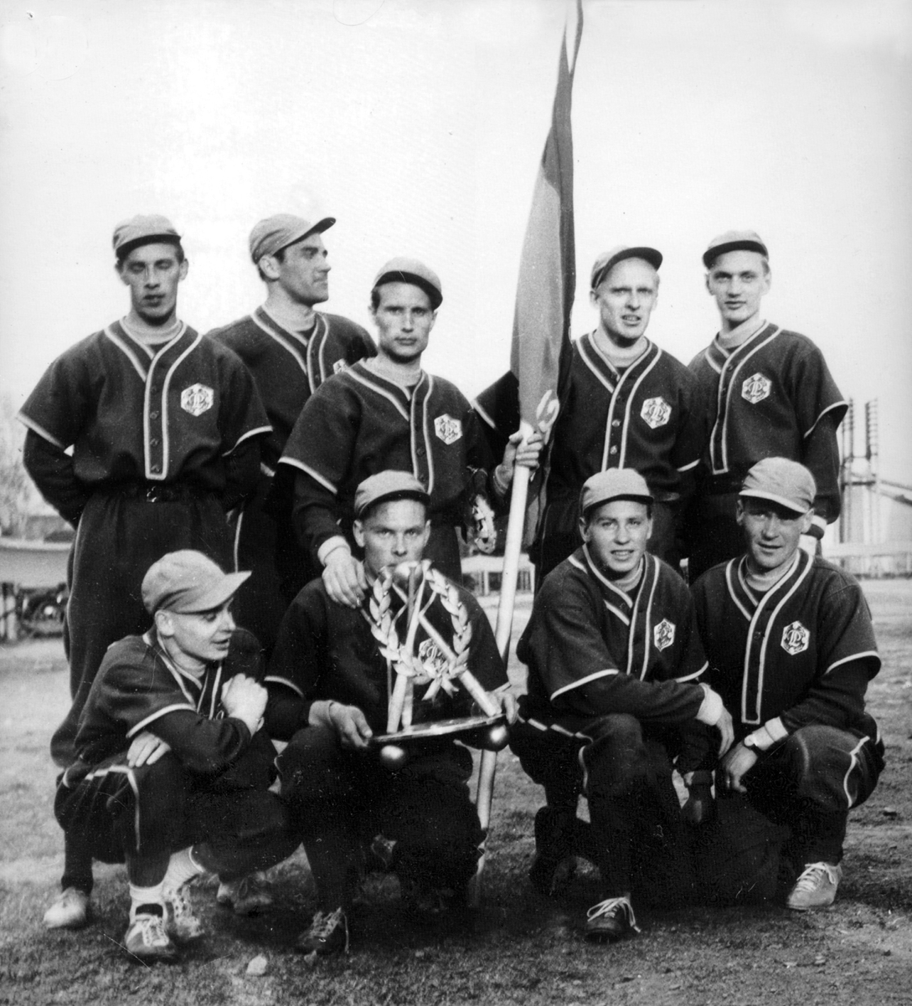 | Loimaa voitti vuoden 1953 Saviseudun kisat. Vieraina olivat Tampereen Pyrintö ja Katajannokan Haukat, joiden keskinäinen peli päättyi Tampereen 7-4 voittoon. Loimaa voitti puolestaan Pyrinnön ylivoimaisesti 15-2, mutta hävisi Haukoille 5-6; jouksuero ratkaisi turnausvoiton. LP:llä oli näissä peleissä ensi kertaa päällään Loimaan Sähkön lahjoittamat ja Nurhosen vaatetusliikkeessä valmistetut baseball-puvut. Pukujen pääväri oli vihreä, puseron ja housujen raidat olivat keltaiset, alla oleva paita ja sukat punaiset, lippalakki oli vihreä. Kauko Leino pitelee käsissään kisojen kiertopalkintoa, jonka ensimmäisiin Saviseudun kisoihin v.1951 järjestänyt oli Ilmari Honkanen. Palkinnon oli suunnitellut taiteilija Ikonen ja valmistanut Turussa kultaseppä Salmela. |
