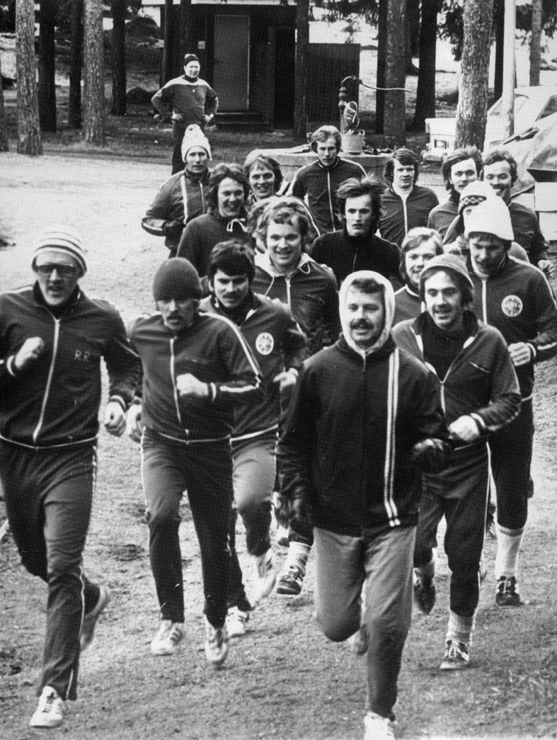 LP harjoituslenkillä v.1974 (4.5.) Pentti Airo vetää joukkoa, eturivissä kaasuttelevat Raimo Reunanen ja "Elvis" Lehtonen. Takimmaisina näkyvät Simo Koivula, Reijo Rahkonen ja Paavo Saastamoinen. Taustalla tarkkailee voimistelunopettaja Sakari Tarkkonen |