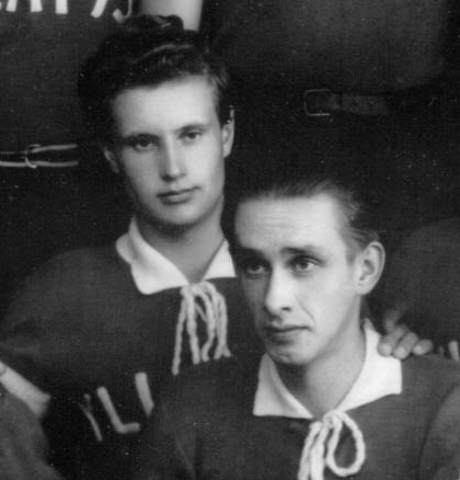 V.1948 Ypäjän Yllätyksessä Otos Ypäjän Yllätyksen joukkuekuvasta. Kuva otettu Valkeakoskella. Joukkue oli juuri saanut uudet peliasut väriltään punaoranssit. Eero vasemmalla, vieressään joukkueen lukkari ja puuhamies Risto Haapakoski. Ypäjä voitti ylivoimaisesti maakuntasarjalohkonsa sekä Raumalla pelatut karsinnat ja nousi suomisarjaan. Eero taisi suorittaa samaan aikaan asevelvollisuuttaan Hyrylässä. Eeron lähtöä LP:stä vähän ihmeteltiin. Eero toimi aikanaan Tapiolan (LP:n urheilutalo ja tanssipaikka) vahtimestarina. Palkkana oli narikkarahat viikonlopun tansseista. Kerrotaan, että kun toimenkuvaan lisättiin lattianpesu, tuli sanomista ja kun oli kaksi pänkkiä vastakkain niin Eero otti ja lähti Ypäjälle. |