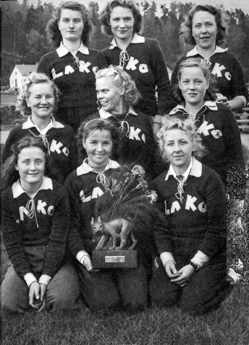 1949 Lahden Koripalloilijat Alarivi vas: Sirkku Riutta [1v] Anja Eskola [L] Seija Asplund [s] Keskirivi vas: Eva Pulkkinen [3v] Hillevi Eskola [p] Leena Vakkilainen [2v] Ylhäällä vas: Inga Nimentö [3va] Suoma Liski [k]) Anna Vuolama [2va] Lisäksi joukkueessa pelasivat Helga Ristolainen, Ulla Pihlantie, Kaija Raaska, Hilkka Rikkonen, ja Sinikka Räihä |
