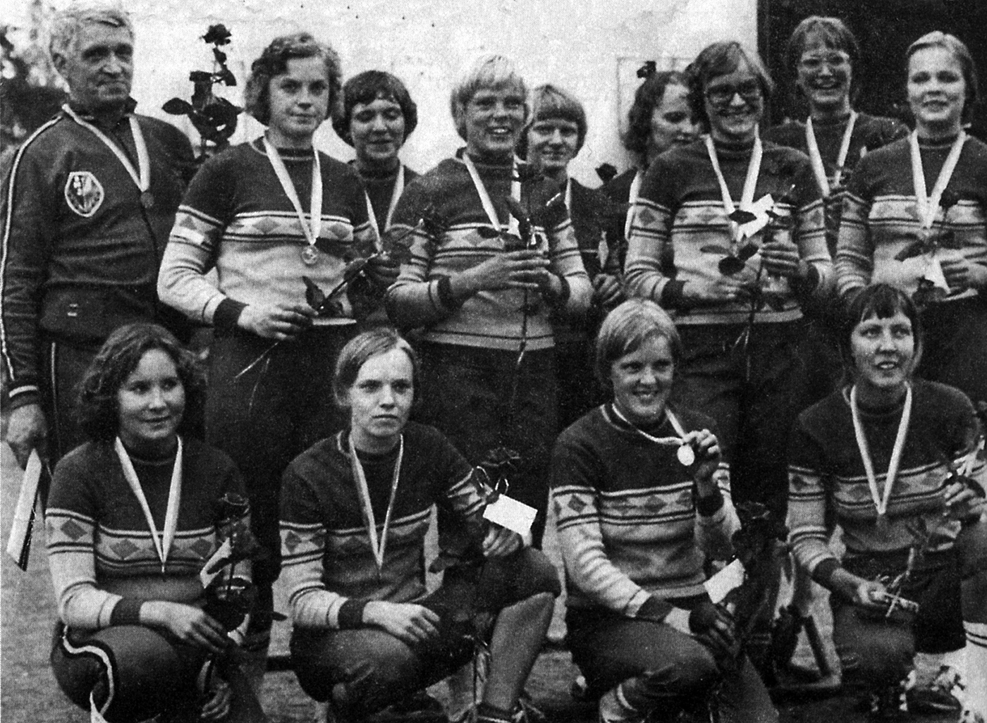 1977 Seinäjoen Maila-Jussit Takarivi vas: Jussi Ristilä [pelinjoht] Pirjo Hiipakka [2p 2v 2k, kapt] Kaisu Ristilä [vp] Marja Ala-Marttila [1v, 2k] Marjatta Saha [vp] Hilkka Kuoppala [2v, 1v] Riitta Mikkola [L] Aulikki Junna [3v] Marja-Leena Liljamo [3p 2p] Edessä vas: Anna Jalonen [vp] Kaija Ojaniemi [3k] Sinikka Ala-Marttila [s] Paula Kallionpää [2k, 3p] Joukkueessa pelasi myös: Kirsti Hannuksela [vp 2k] |